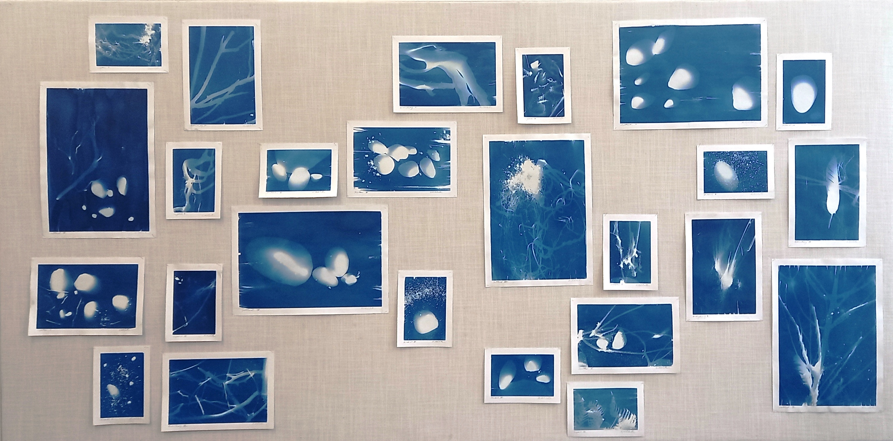 This collection of cyanotype prints was created on the bed of the Wanganui River near Harihari. The cyanotype process is one of the oldest forms of photographic printing, two chemicals are combined into a light sensitive mixture, which turns blue after being exposed to UV light. I painted the mixture onto sheets of watercolour paper, and on a few fine days over the spring I took them to the riverbed. Collecting river debris and natural materials from the riverbed I created ephemeral compositions. After exposing the paper to the sun for a few minutes, the chemicals are wasked away. Where the river’s contribution blocked sunlight white paper or lighter tones are revealed.